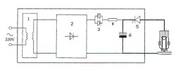 储能式螺柱焊机采用220V交流电,通过变压器1降压,再通过整流桥2将交流电变为直流电,经过双向整流管3和充电电阻向电容6充电。由智能芯片精确控制可控硅5,使储能电容6瞬间释放全部电量完成整个焊接过程。